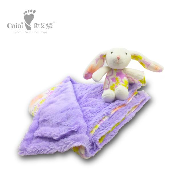 This is a purple plush animal infant bunny toy with flower pattern printed flannel blanket. We design and produce most of our products in China and we promote them via a well-established and fast-growing network of distributors in more than 30 provinces. Moreover, our products have reached 14 countries via the internet.
